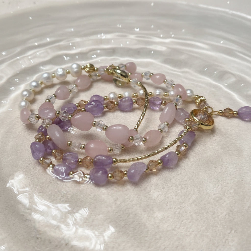 Materiał: perły słodkowodne, kwarc różowy/fioletowy, mosiądz i żywica