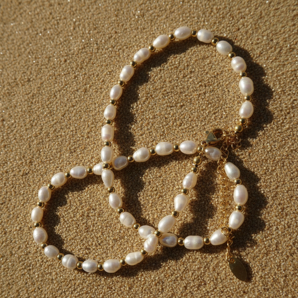 Materiał: stal chirurgiczna pozłacana 18k złotem i perły słodkowodne naturalne, każda sztuka jest inna