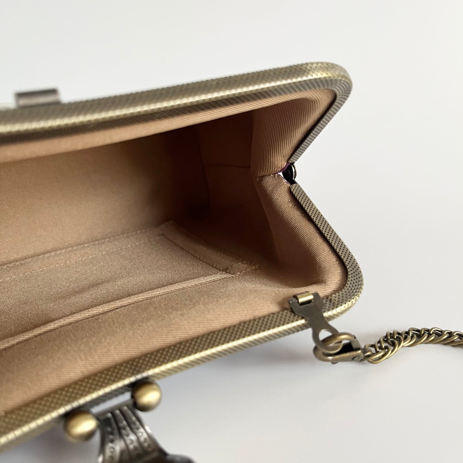Torebka ze złotymi klasycznymi dodatkami. Jej uniwersalny charakter sprawia, że będzie idealnie pasować do większości stylizacji. Do sukienki wieczorowej i letniej, do kostiumu biurowego, do jeansów na co dzień – jedna torba, a tak wiele możliwości! Wszystkie nasze torby są szyte ręcznie i zdobione orientalnymi detalami. Są także, czymś więcej niż modnym dodatkiem, symbolizują styl życia i wartości odwzorowane w zdobiących je motywach. Torebki nie są przeznaczone do noszenia ciężkich rzeczy.