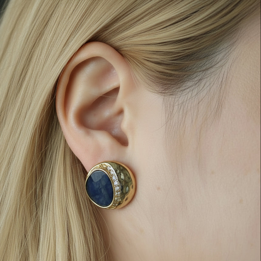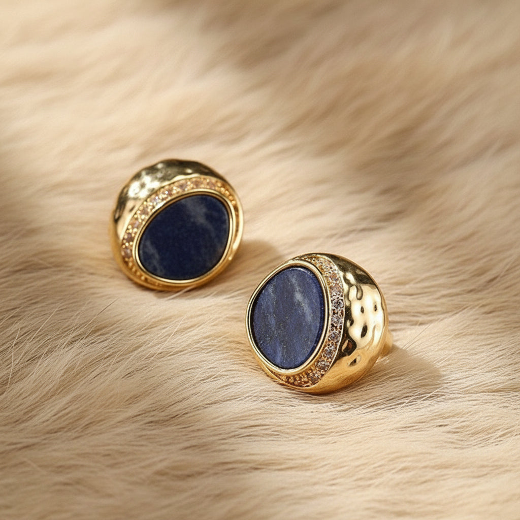 Materiał: lapis lazuli, cyrkonia, mosiądz pozłacany, sztyfty ze srebra z próbą 925