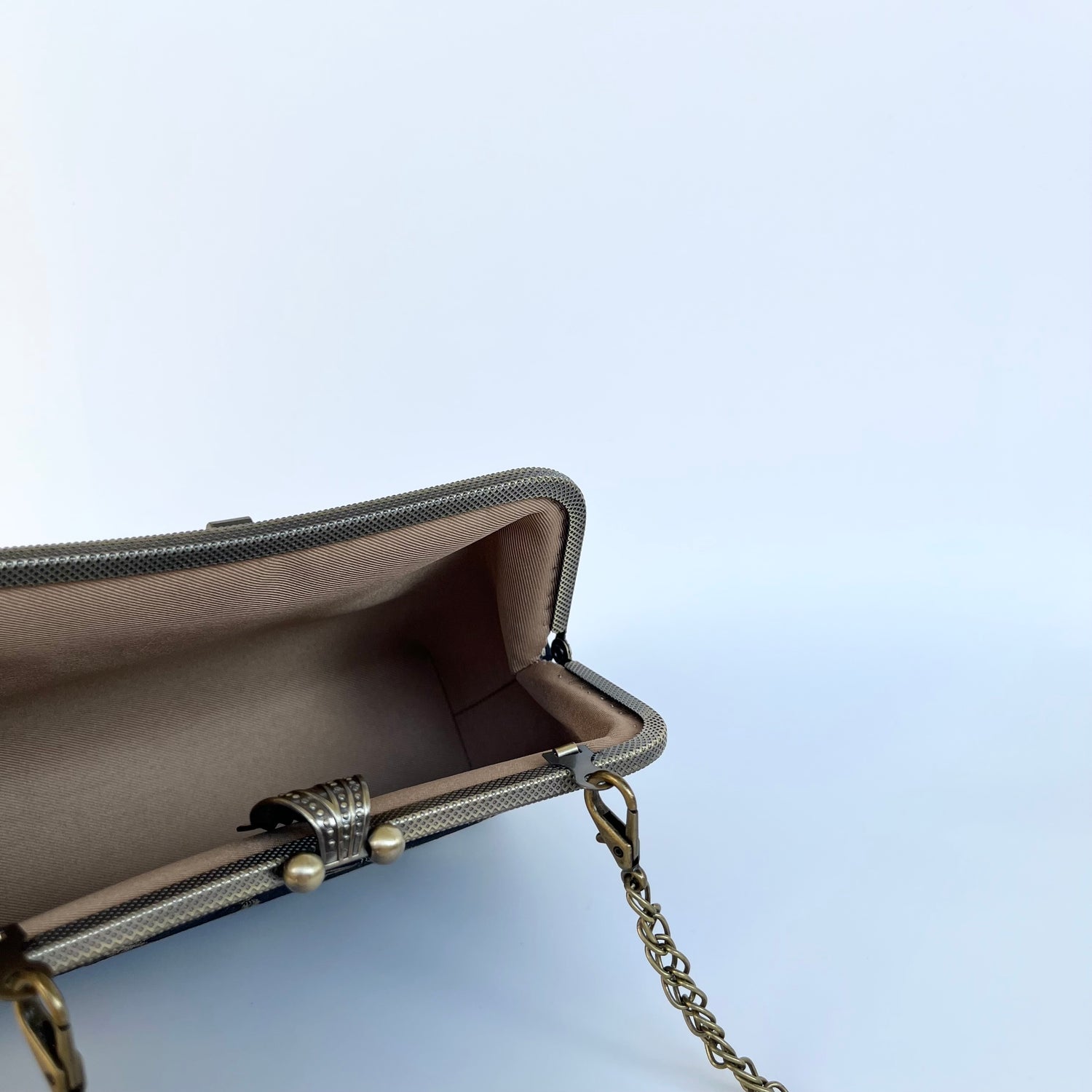 Torebka ze złotymi klasycznymi dodatkami. Jej uniwersalny charakter sprawia, że będzie idealnie pasować do większości stylizacji. Do sukienki wieczorowej i letniej, do kostiumu biurowego, do jeansów na co dzień – jedna torba, a tak wiele możliwości! Wszystkie nasze torby są szyte ręcznie i zdobione orientalnymi detalami. Są także, czymś więcej niż modnym dodatkiem, symbolizują styl życia i wartości odwzorowane w zdobiących je motywach. Torebki nie są przeznaczone do noszenia ciężkich rzeczy.