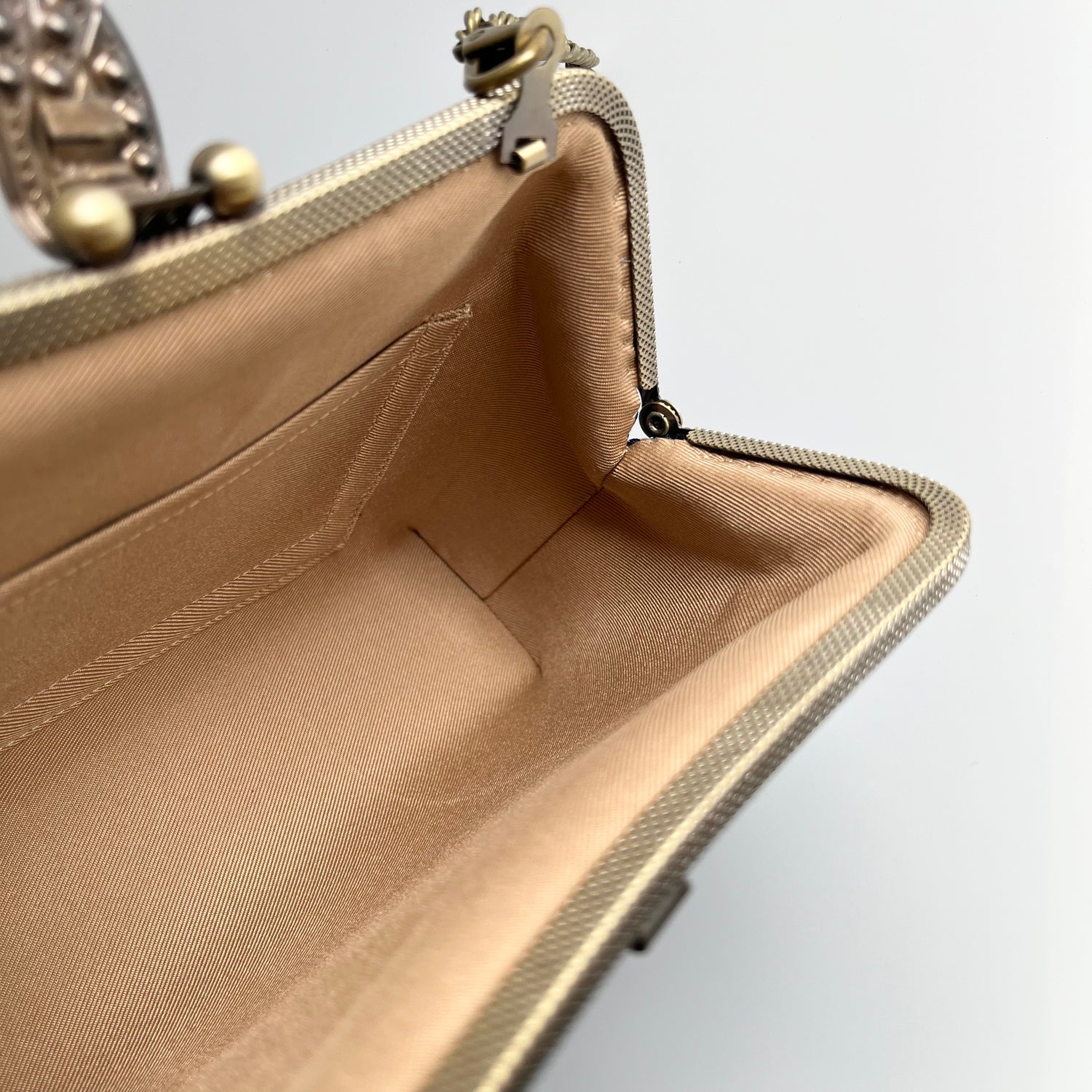 Torebka ze złotymi klasycznymi dodatkami. Jej uniwersalny charakter sprawia, że będzie idealnie pasować do większości stylizacji. Do sukienki wieczorowej i letniej, do kostiumu biurowego, do jeansów na co dzień – jedna torba, a tak wiele możliwości! Wszystkie nasze torby są szyte ręcznie i zdobione orientalnymi detalami. Są także, czymś więcej niż modnym dodatkiem, symbolizują styl życia i wartości odwzorowane w zdobiących je motywach. Torebki nie są przeznaczone do noszenia ciężkich rzeczy.